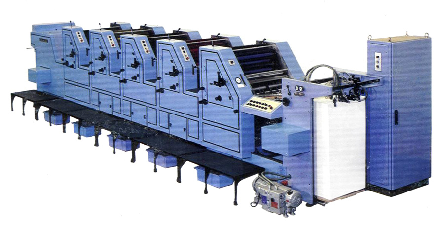Impressora offset formato meia folha com 4 rolos entintadores por unidade impressora e sistema de pinças oscilantes.